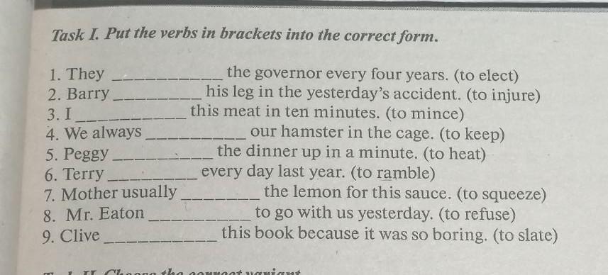 1-elect 2-injured 3-will mince 4-keep 5-will heat 6- rambled 7- squeezes 8-refused 9- will slate