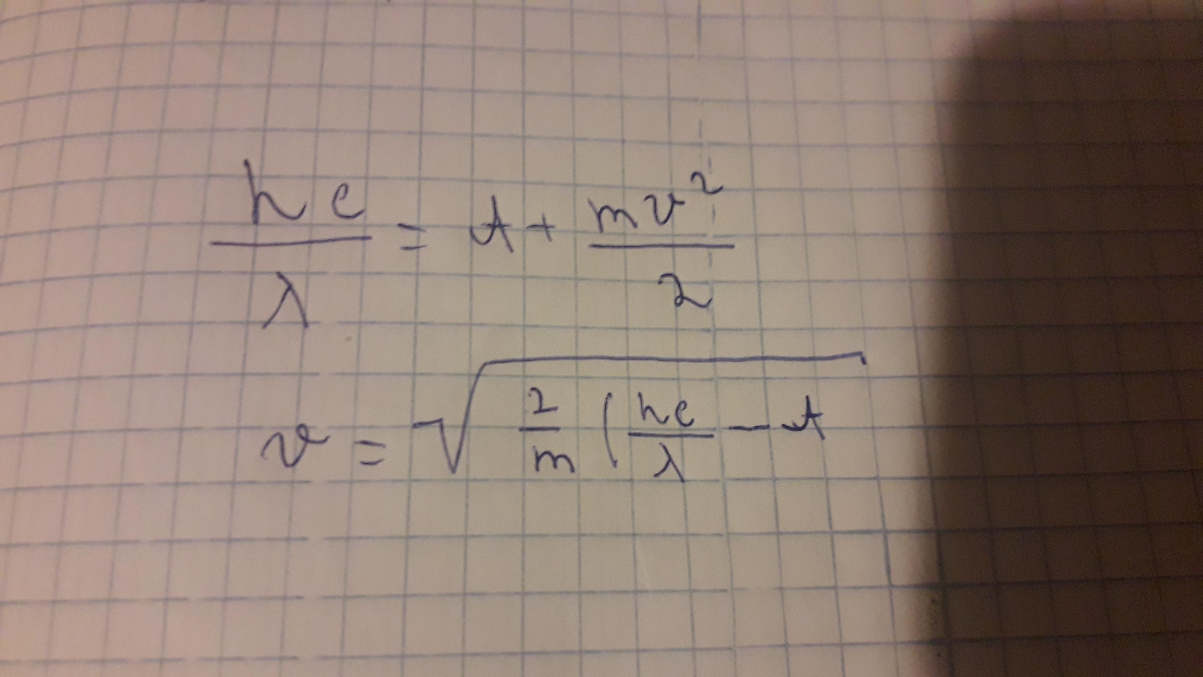 =2/9.1E-31*(6.62E-34*300000000/0.00000059-3.02E-19)=2.76e5 м/с