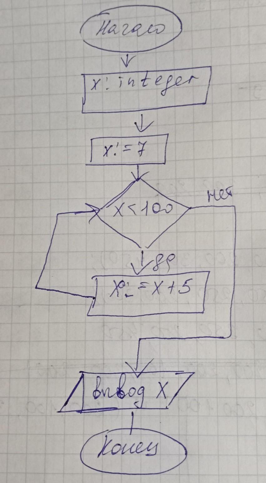 Составьте блок-схему алгоритма нахождения суммы чисел, первое из которых равна 7, каждое следующее на 5 больше предыдущего и все они не превышают 100 Выполните алгоритм.