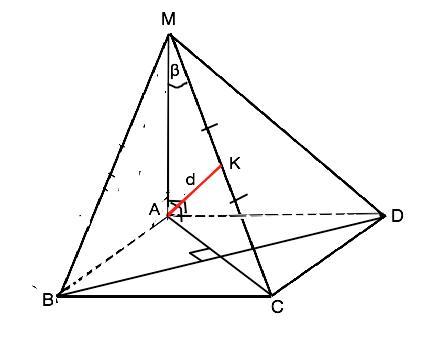 Диагонали квадрата равны и пересекаются под прямым углом. AC=BD=MC•sinβ=2d•sinβ