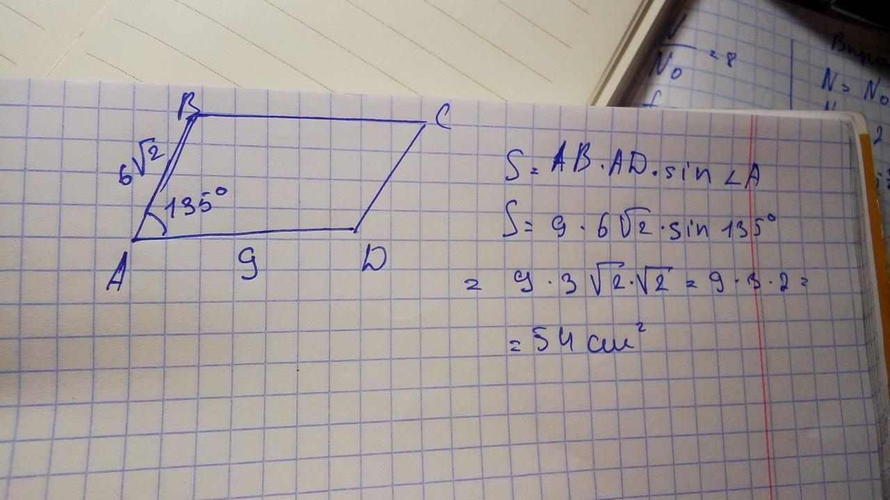 Сторони паралелограма дорівнюють 6√2 см і 9 см,а кут між ними 135°.Знайдіть площу паралелограма.Пожалуйста сделайте с рисунком,очень надо сейчас
