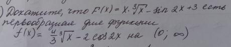 Помогите пожалуйста. Докажите, что F(x)=x * кубический корень на x - sin2x + 3 если первообразная для функции f(x) = 4/3 кубический корень на x - 2 cos2x на (0 ; +∞).