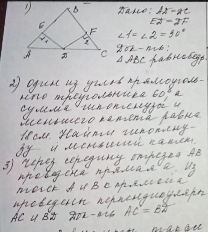3. они равны, потому что углы будут равны, потому что одни - вертикальные, а одни прямые и сторона равна т к прямая проходит через середину отрезка