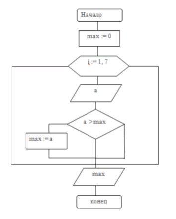 Организовать цикл "Для" для 7 итераций, ввести 7 чисел и найти max число из