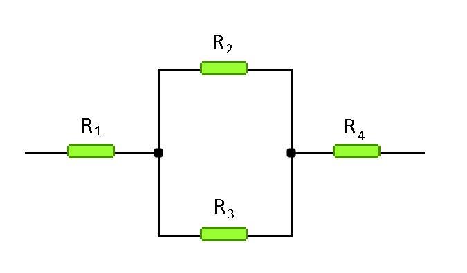 Вычислите общее сопротивление электрической цепи, если сопротивления первого и четвёртого резисторов одинаковы и равны 1 Ом, а второго и третьего – 3 Ом и 7 Ом соответственно. Ответ запишите в СИ.
