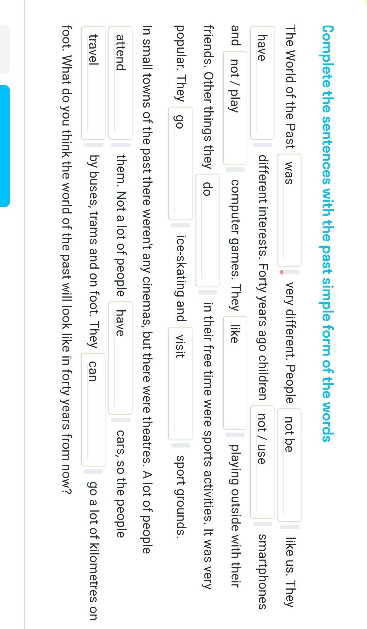 2 weren’t 3 had 4 didn’t use 5 didn’t play 6 liked 7 did 8 went 9 visited 10 attended 11 had 12 traveled 13 could
