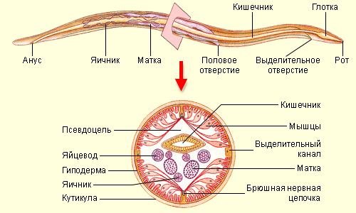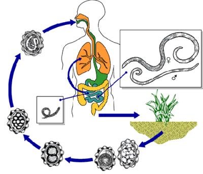 Цикл развития аскариды:Каждая половозрелая женская особь аскариды ежедневно откладывает порядка 200000 яиц, покрытых надежной пятислойной оболочкой, которая помогает сохранить жизнеспособность яиц практических в любых, даже весьма агрессивных условиях.Поскольку аскарида человеческая, как и все нематоды, не имеет промежуточного хозяина, развитие личинки происходит непосредственно во внешней среде. Все, что ей необходимо — доступ кислорода, достаточная влажность и температура, близкая к комнатной. Как правило, эта стадия развития аскариды завершается на 16-17 сутки, когда в яйце формируется созревшая личинка и оно становится инвазионным, то есть, опасным для человека.Как только инвазионное яйцо попадает в организм человека (с пищей, через немытые руки, загрязненную воду и т.д.), под воздействием химической среды желудочно-кишечного тракта человека оболочки яйца растворяются и личинка попадает в кишечник, свое любимое место обитания. Однако, возможны и другие варианты развития событий, когда микроскопическая личинка не остается в кишечнике, а мигрирует по кровеносной системе, оказываясь порой в самых неожиданных местах. Нередки случаи, когда аскарид в больших количествах находили в желудочке сердца больного, в альвеолах, бронхах и трахее, в печени и даже в мозге.Строение аскаридыВ общей сложности, для развития взрослой особи из яйца необходимо около 70 суток, хотя при благоприятных условиях этот процесс может протекать и быстрее. При температуре ниже 12° С развитие гельминтов тормозится, но яйца сохраняют жизнеспособность. Полностью уничтожает их только спирт, эфир, кипячение и прямые солнечные лучи. Также следует заметить, что нахождение в земле не является необходимым условием для формирования личинки в яйце аскариды: при аутоинвазии (самозаражении) созревание яиц происходит непосредственно в организме хозяина!Цикл развития аскаридыОсновная опасность поражения аскаридами состоит в том, что они чрезвычайно сильно снижают иммунитет человека, проникая практически во все органы и ткани, где вызывают воспалительные процессы и тяжелые осложнения, такие, как непроходимость кишечника, закупорка желчных протоков, пневмония, хронический холецистит, хронический панкреатит и др.