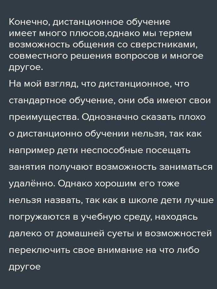 Әрине, қашықтықтан оқытудың көптеген артықшылықтары бар, дегенмен, біз құрдастарымызбен сөйлесу, мәселелерді бірлесіп шешу және басқа да мүмкіндікті жоғалтып аламыз. Менің ойымша, бұл қашықтық, бұл стандартты жаттығу, бірақ екеуінің де артықшылығы бар. Қашықтан оқыту туралы нақты жаман сөздер айту мүмкін емес, өйткені, мысалы, сабаққа бара алмайтын балалар қашықтан оқуға мүмкіндік алады. Алайда мұны жақсы деп те атауға болмайды, өйткені мектепте балалар үй жағдайына көнбейтіндіктен және назарын басқа нәрсеге аудару мүмкіндігіне ие бола отырып, оқу ортасына жақсы енеді.