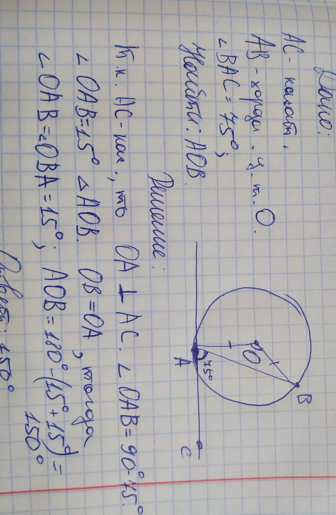 АС-касательная, а АВ- хорда окружности с центром в точке О, ∠ ВАС равен 75°. Чему равен ∠ АОВ?