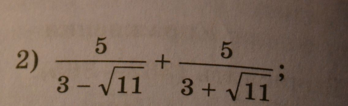 5(3+корень 11)+5(3-корень 11)/(3-корень 11)(3=корень 11)=15=5корень11+15-корень11/(3-корень11)(3+корень 11)=30/9+3корень11-3корень11-11=30/-2=-15.
