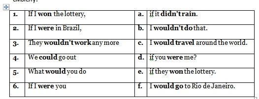 Объяснение:1-c.если бы я выиграл лотерею, я бы путешествовал по миру .2-f.Если бы я был в Бразилии я бы поехал в Рио-де-Жанейро.3-e.Они больше не будут работать, если выиграют лотерею.4-a. Мы могли бы пойти гулять если бы не было дождя.5-d.Что бы ты сделал если был бы на моём месте?.6-b. На твоём месте я бы этого не делал.