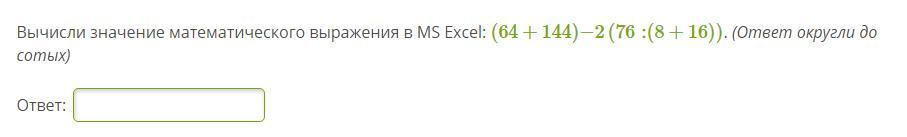 Вычисли значение математического выражения в MS Excel: (64+144)−2(76:(8+16)). (Ответ округли до сотых)