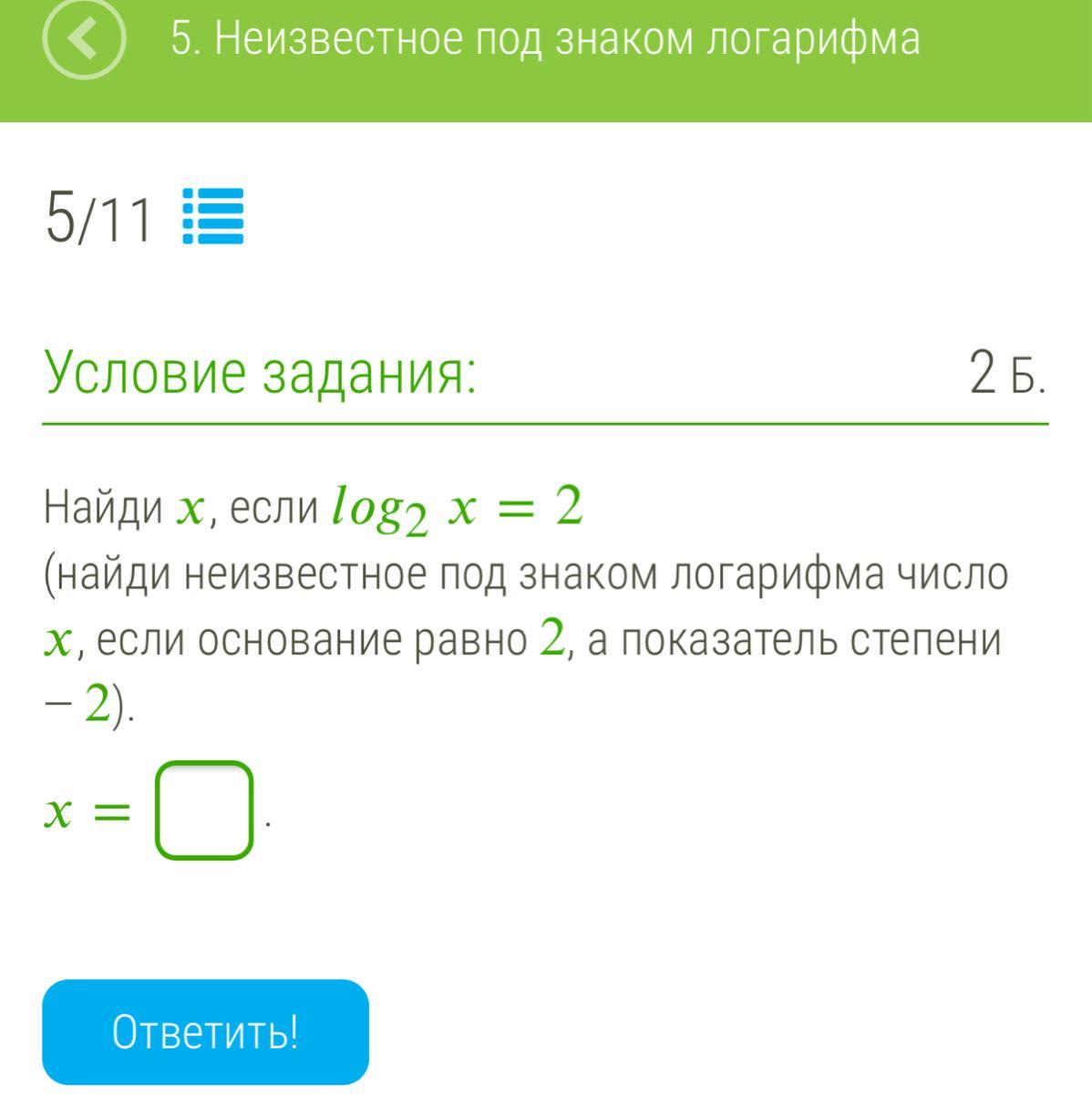 (найди неизвестное под знаком логарифма число , если основание равно 2, а показатель степени — 2).