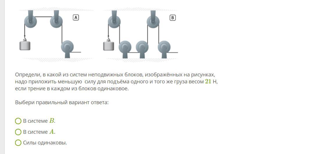Определи, в какой из систем неподвижных блоков, изображённых на рисунках,