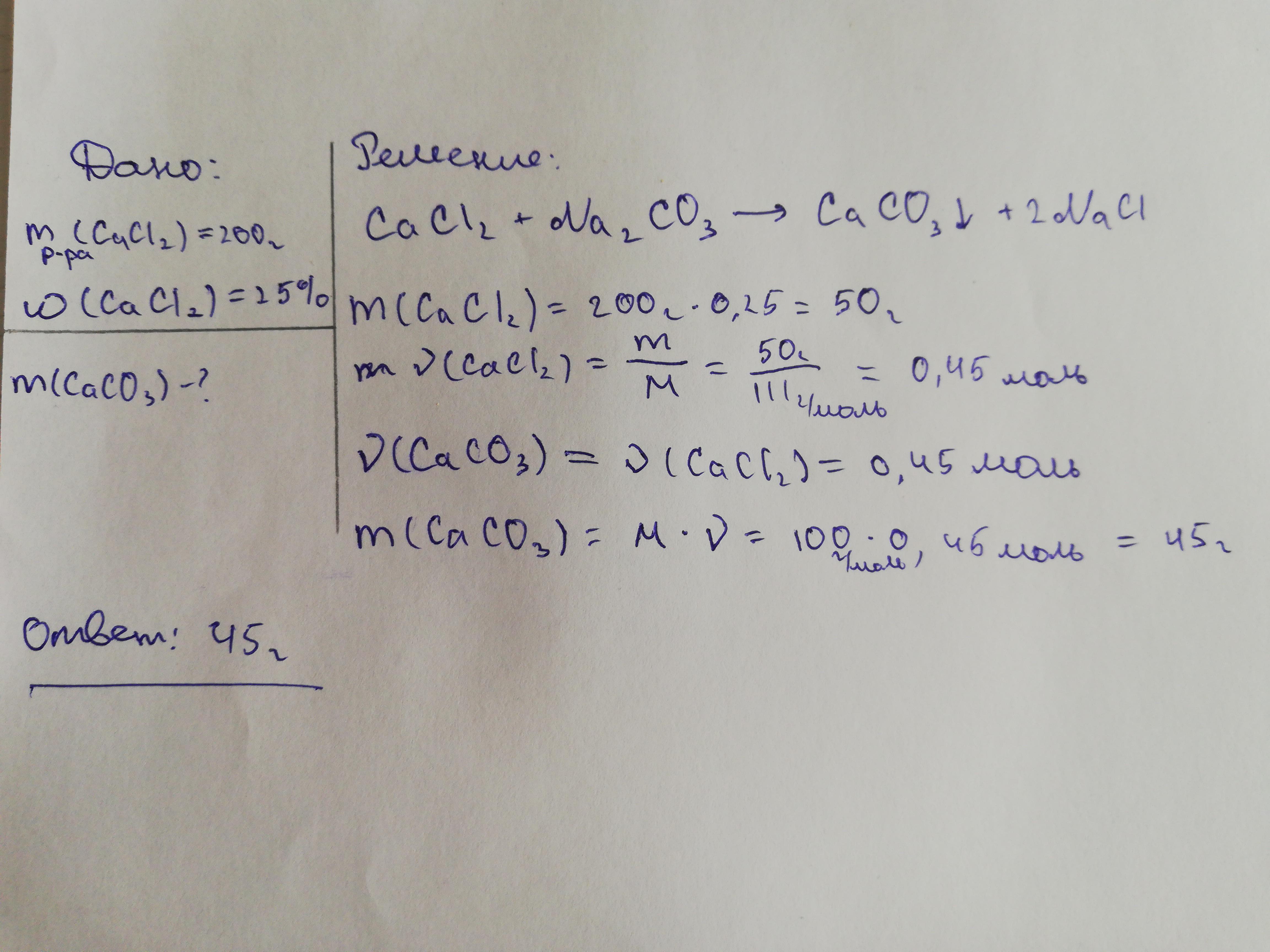. Рассчитайте массу осадка, который образуется при взаимодействии 200г хлорида кальция, концентрацией 25% и карбоната натрия.