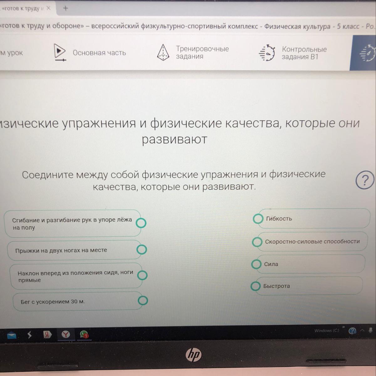 Ответ:сгибание и разгибание рук в упоре лёжа на полу Сила придёт на двух ногах на месте гибкость наклон вперёд из положения,сидя ноги прямие скоростно-силовие способности