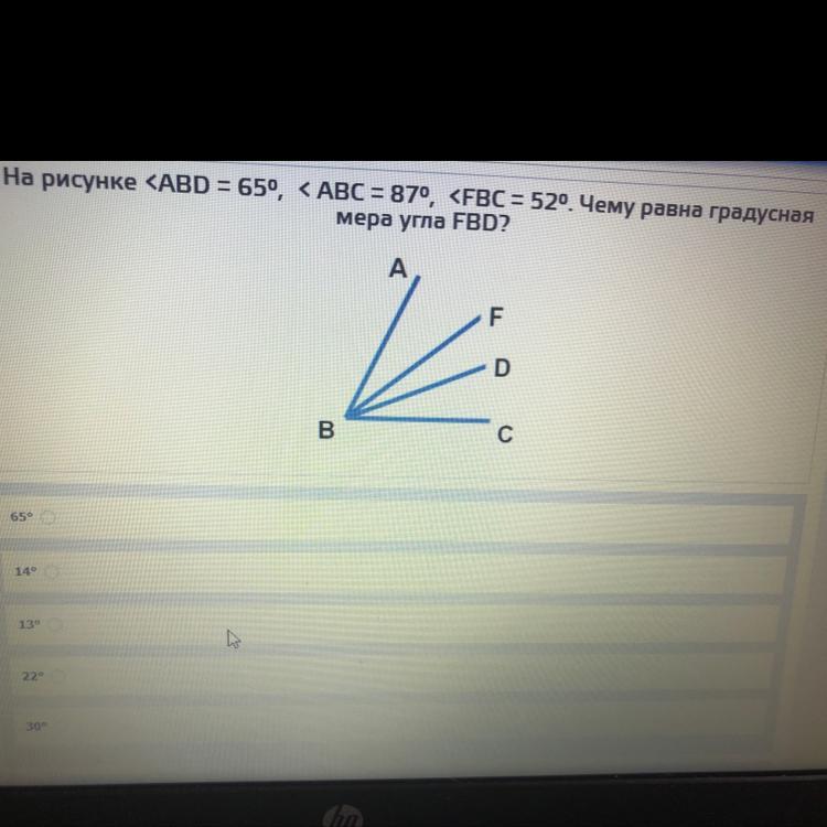∠FBD= ∠ABC-∠DBC-∠ABF= 87-22-35= 30°