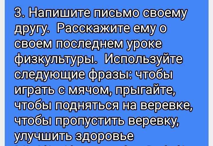 Ответ:Привет дорогой друг, как у тебя дела? У меня хорошо, на последнем уроке физкультуры нас учили как играть в мяч, а затем нам говорили прыгать на корточках, было очень весело, ещё мы поднимались по верёвке, и пропускали её через себя, а что бы улучшить здоровье мы бегали кросс, досвидания дорогой друг!