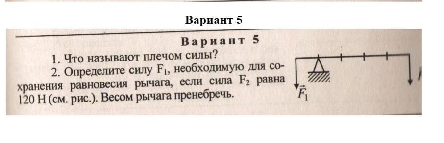 Определите силу F1, необходимую для сохранения равновесия рычага, если сила F2 равно 120Н. Весом рычага пренебрег (см. рис.)