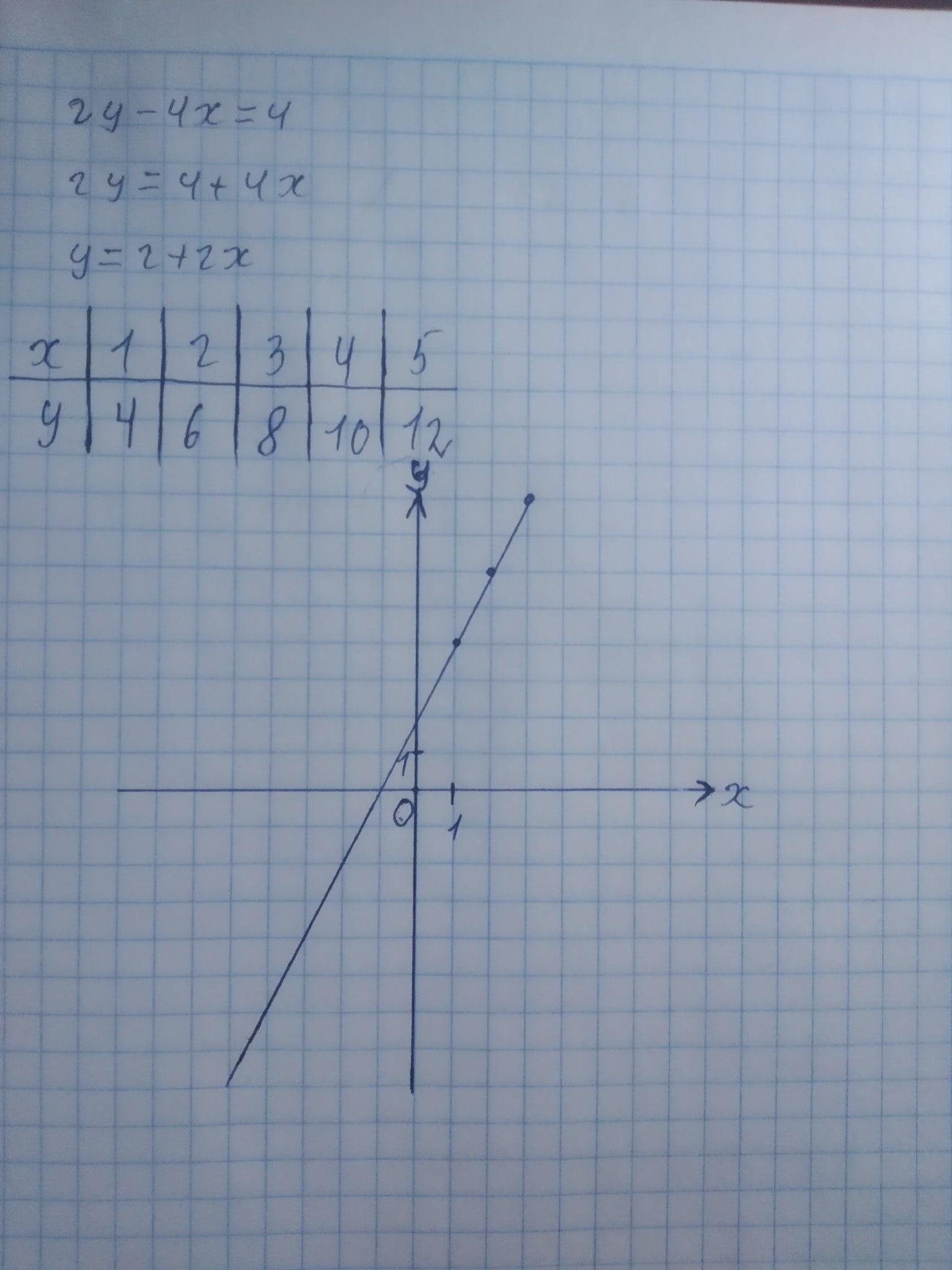 дано линейное уравнение 2y-4x=4. Постройте график уравнения, соблюдая три шага 1. выразить y, 2. таблица. 3. График по точкам.