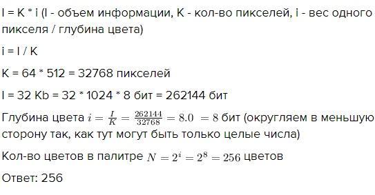 несжатое растровое изображение размером 64 на 512 пикселей занимает 16 килобайт памяти каково максимально возможности числа цветов в палитре изображения