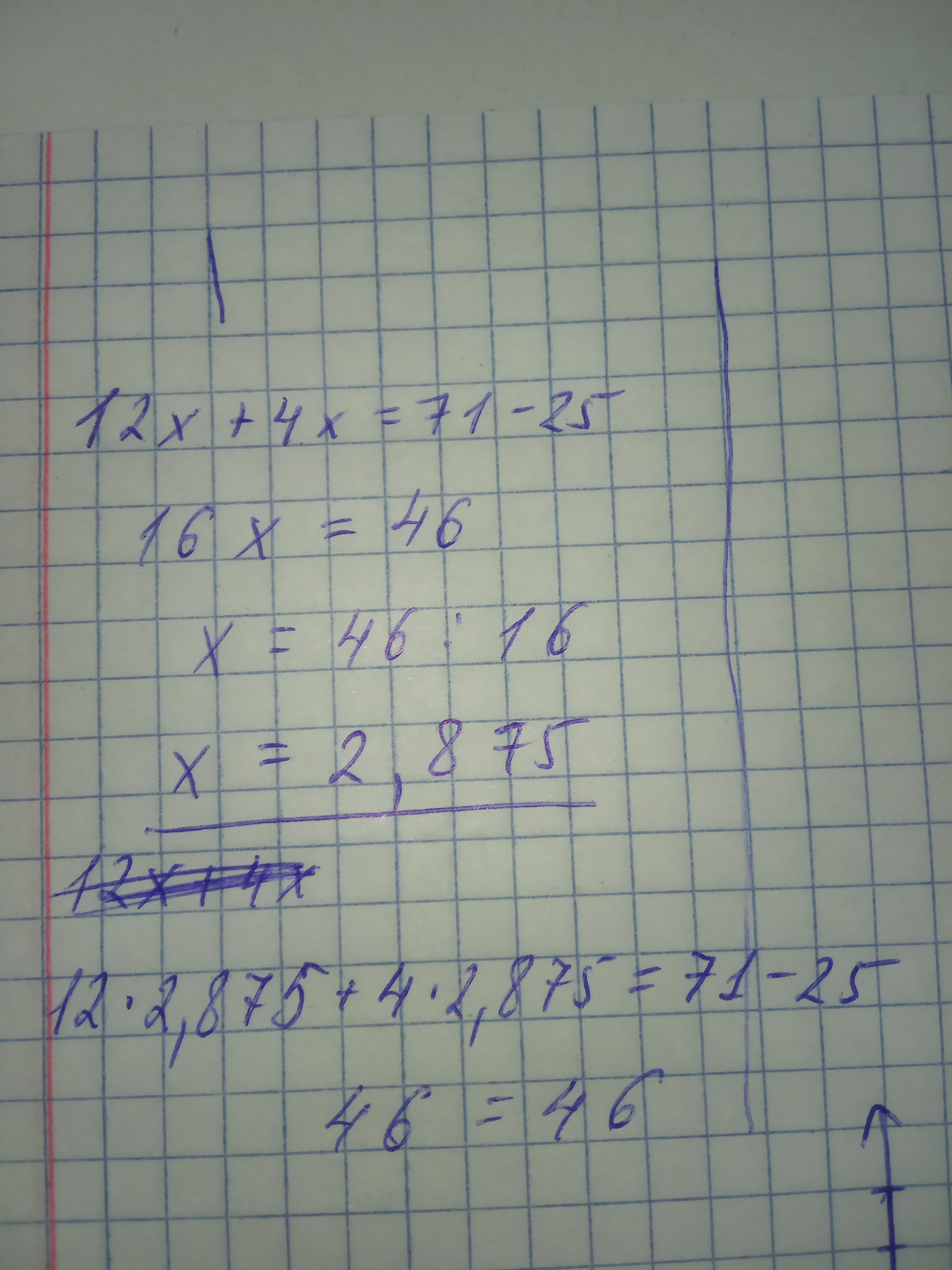 х=2.87 12*2.87+4*2.87=71-25 46=46