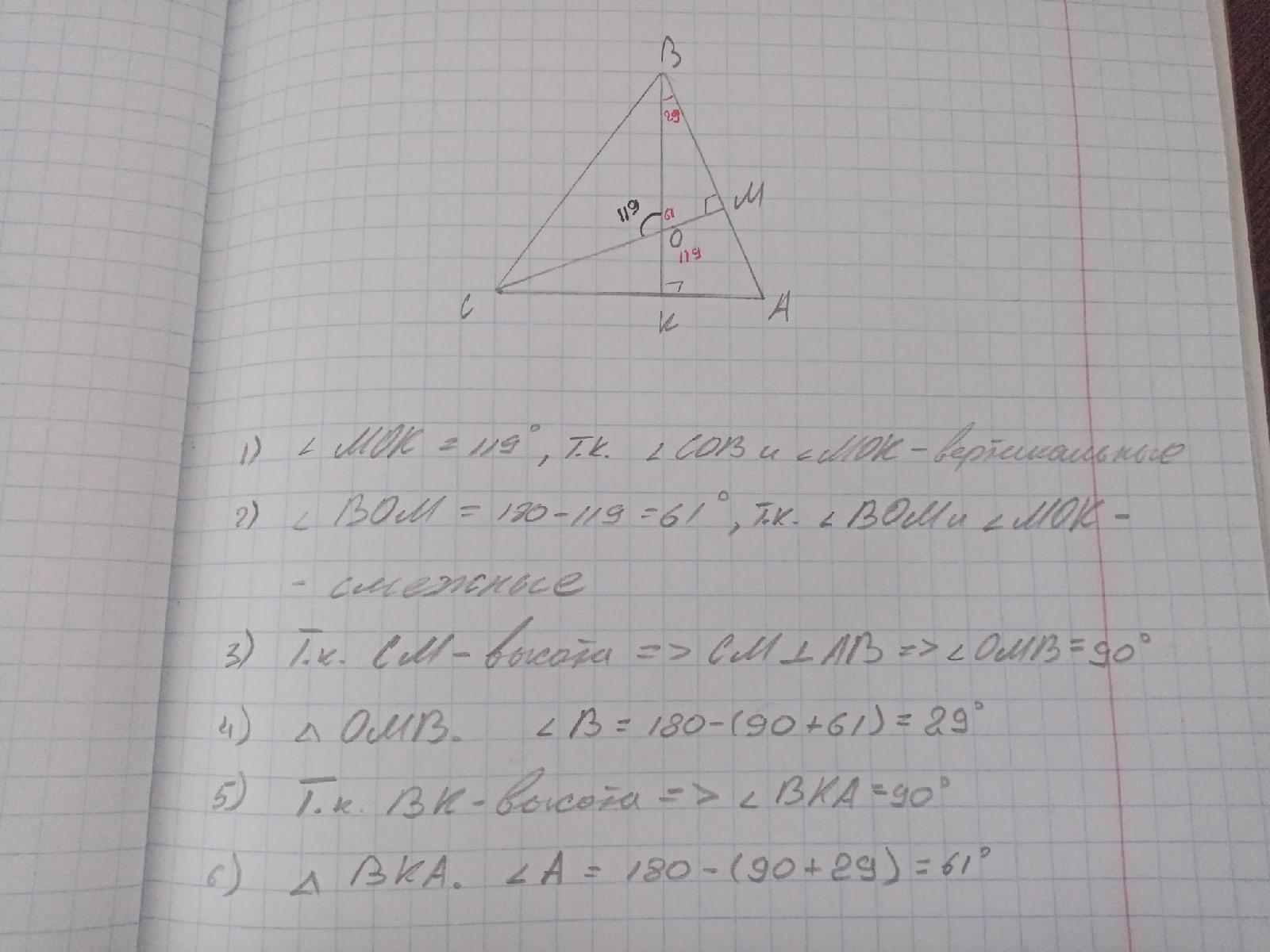 пересекаются в точке О. Угол СОВ равен 119˚. Найти угол А.