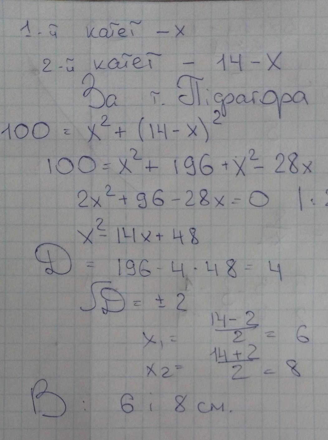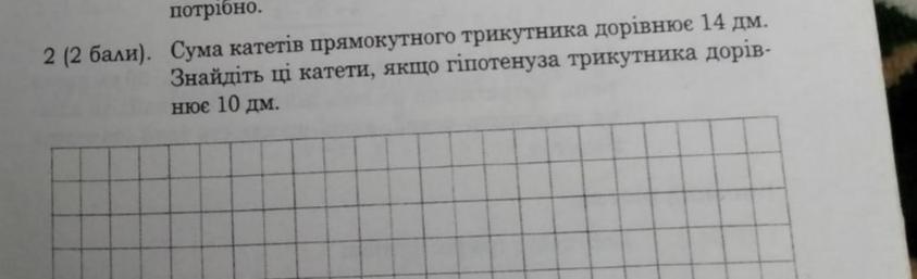 Сума катерів прямокутного трикутника дорівняє 14 дм. Знайдіть ці катери, якщо його гіпотенуза дорівнює 10 дм