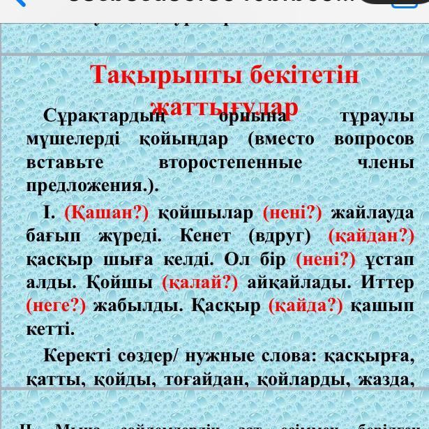 1.Жазда қойшылар қойды жайлауда бағып жүреді.Кенет тоғайдан қасқыр шыға келді.Ол бір қойды ұстап алды. Қойшы қатты айқайлады.Иттер қасқырға жабылды.Қасқыр тоғайға қашып кетті