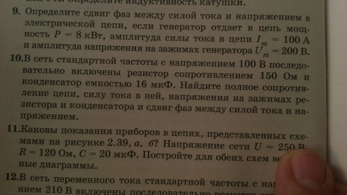 В сеть стандартной частоты с напряжением 100 В последовательно включены резистор сопротивлением 150 Ом и конденсатор емкостью 16 мкФ. Найдите полное сопротивление цепи, силу тока в ней, напряжения на зажимах резистора и конденсатора и сдвиг фаз между силой тока и напряжением