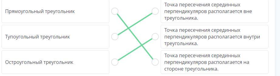установите соответствие между видом треугольника и точкой пересечения серединных перпендикуляров: 1)остроугольный треугольник, 2)тупоуголный треугольник, 3)прямоуголный равнобедренный треугольник-----а) точка пересечения серединных перпендикуляров на стороне треугольника, б) точка пересечения серединных перпендикуляров внутри треугольника, в) точка пересечения серединных перпендикуляров вне треугольника ПОМОГИТЕ ПОЖАЛУЙСТА!!!