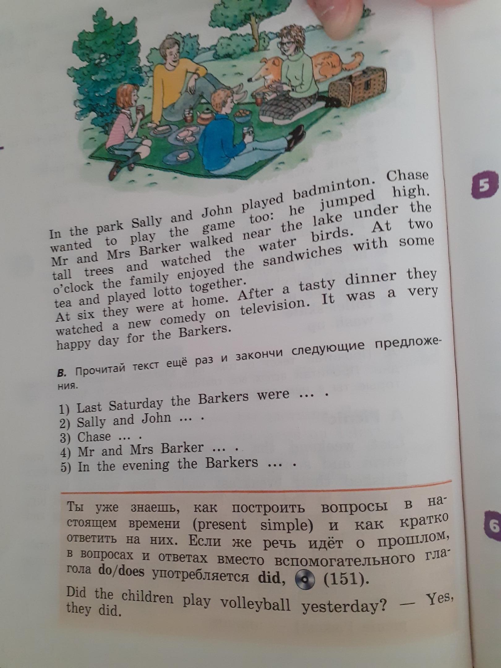 4)Mr and Mrs Barker walked near the lake under the tall trees and watched the water birds.