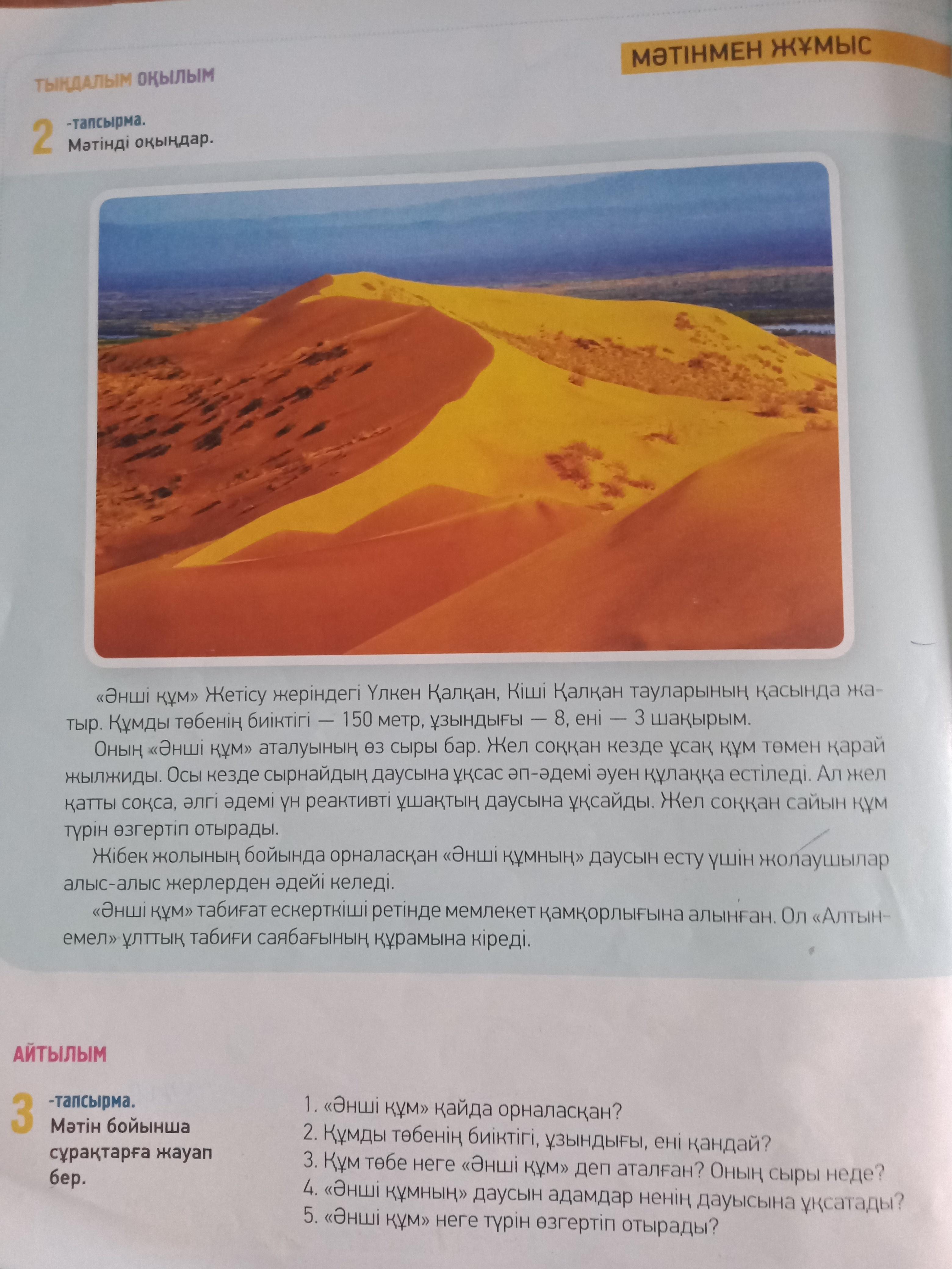 қалай ән айтады? жел соққан кезде ұсақ құм төмен қарай жылжиды. осы кезде сырнайдың дауысына ұқсас әп әдемі әуен құлаққа естіледі. ал жел қатты соқса, әлгі әдемі үн реактивті ұшақтың дауысына ұқсайды