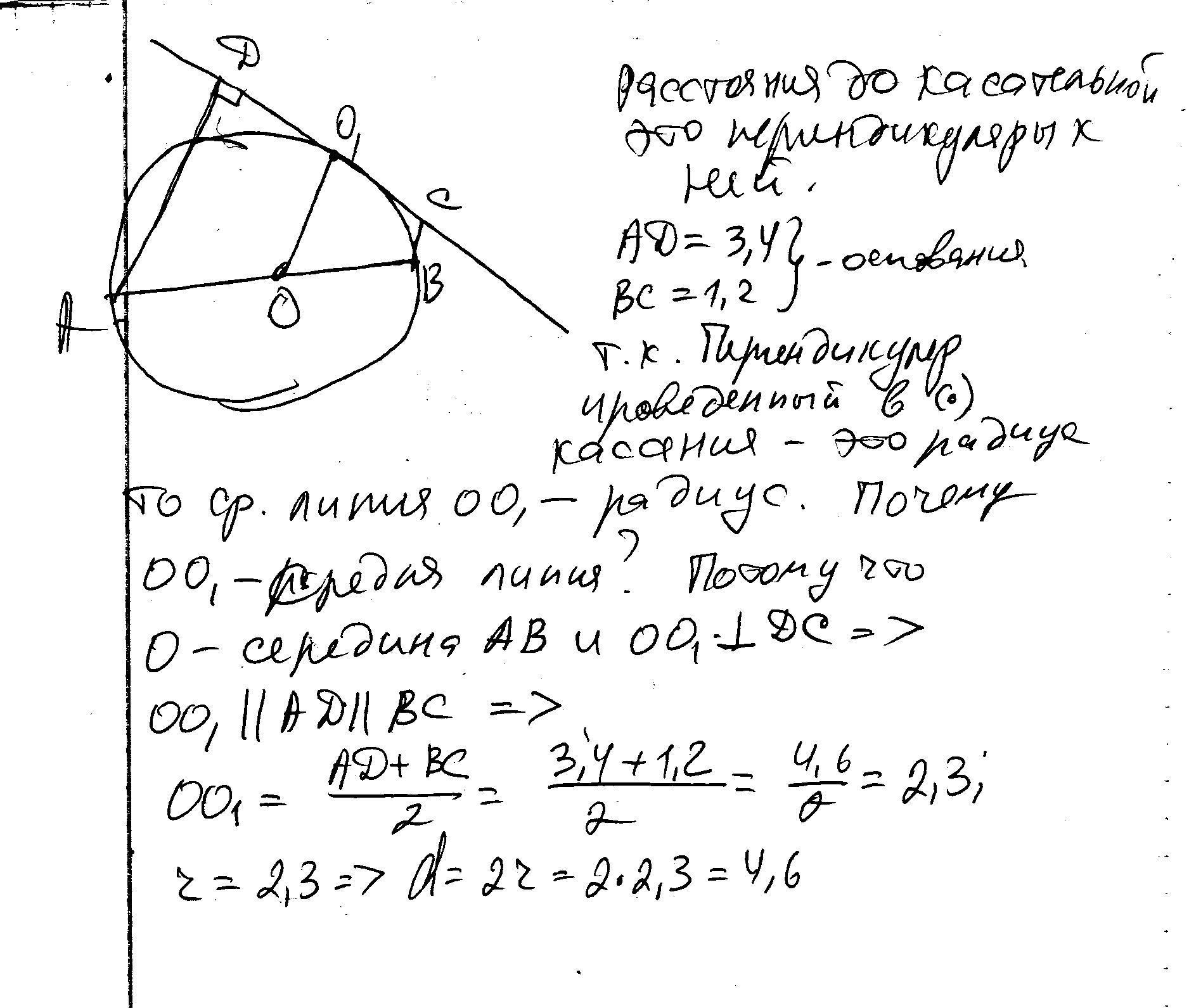 концы диаметра окружности находятся на расстоянии 3,4 дм и 1,2 дм от ее касательной.найдите длину диаметра.(помогите плиз)