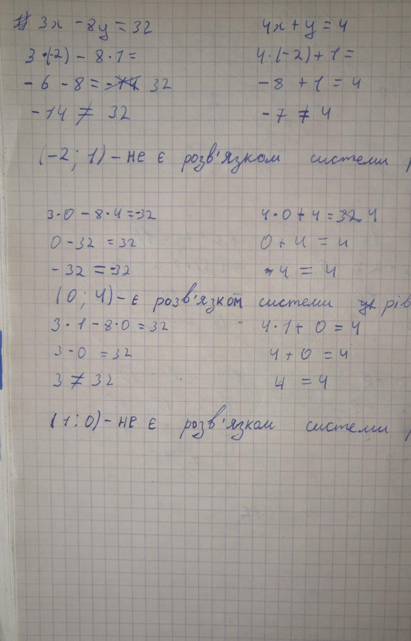 Яка Пара чисел розв'язком системи рівнянь 3х-8у=32 та 4х+у=4.? а) (-2;1), б) (0;4)., в) (1;0)???