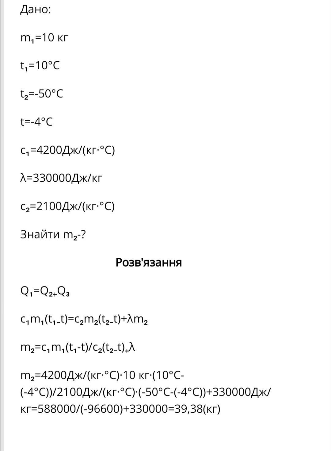 В посудину, що містить 10 кг води при температурі 10 °С, поклали лід, який має температуру (–50 °С). В результаті теплообміну встановилася температура (–4 °С). Визначте масу льоду. Питома теплоємність води 4200 Дж/кгꞏК, питома теплота плавлення льоду 3,32 кДж/кг, а його питома теплоємність 2100 Дж/кгꞏК.