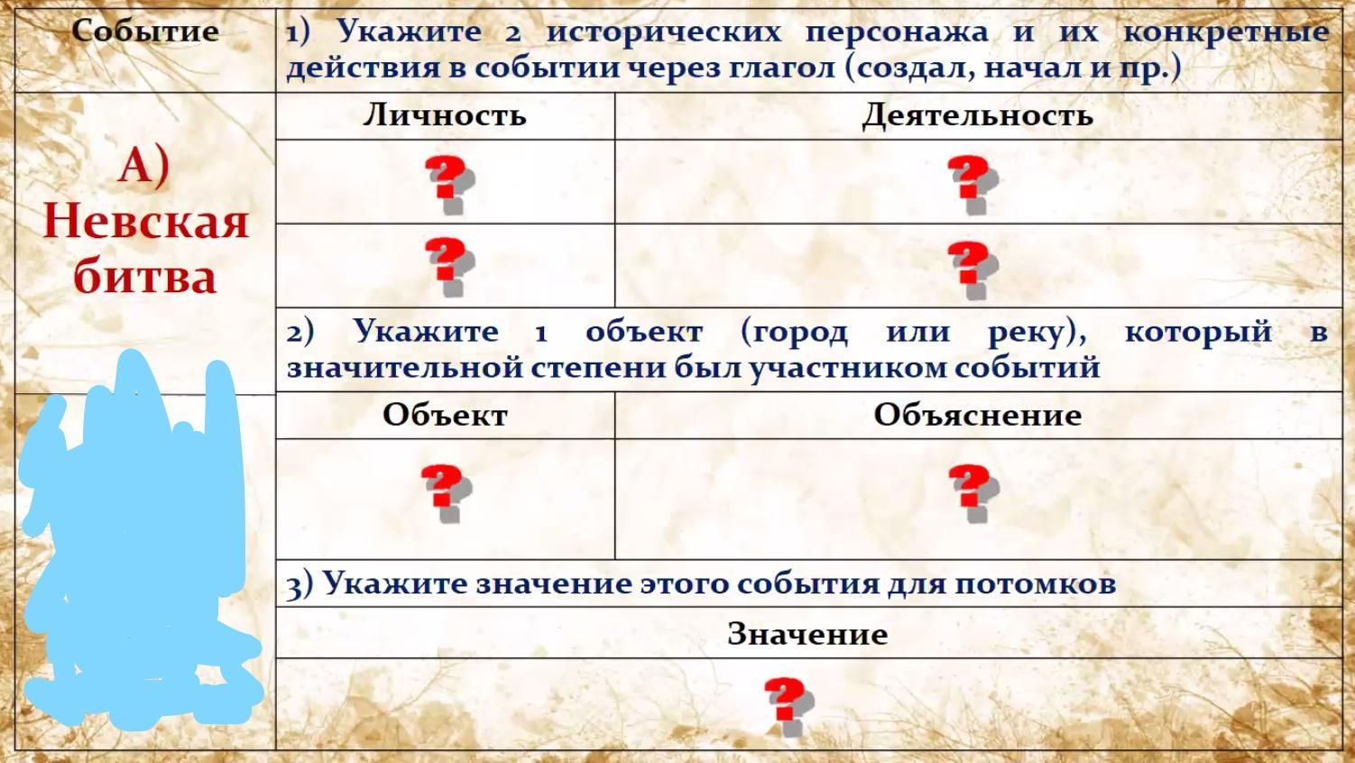 Ответ:личность:Александр Невский .Деятельность: руководил русским войском , новгородский князь.Личность:Биргер.Деятельность:шведский король, руководил шведским войском.
