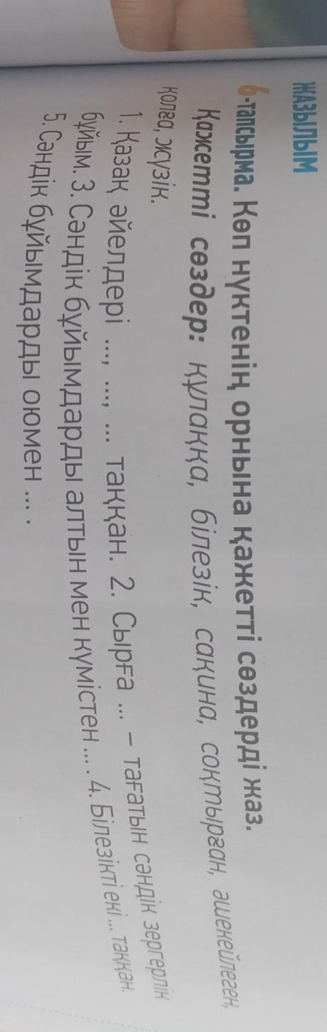 1. Қазақ әйелдері білезік, сақина, жүзік таққан. 2. Сырға - құлаққа тағатын сәндік зергерлік бұйым. 3. Сәндік бұйымдарды алтын мен күмістен соқтырған. 4. Білезікті екі қолға таққан. 5. Сәндік бұйымдарды оюмен әшекейлеген.