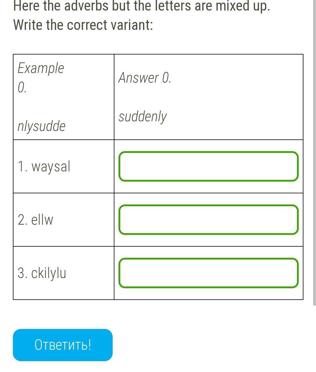 Here the adverbs but the letters are mixed up. Write the correct variant