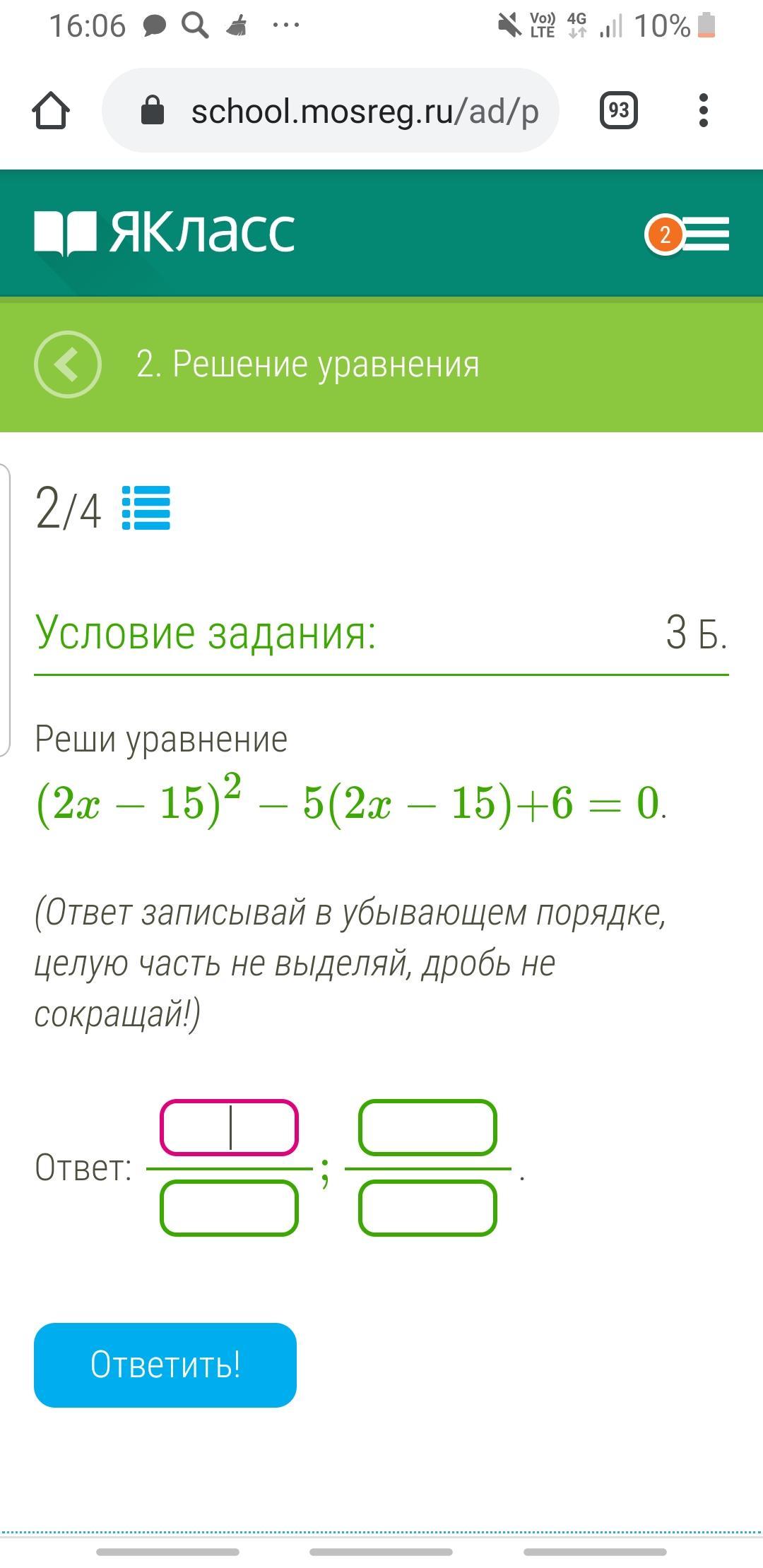 Реши уравнение (2x−15)^2−5(2x−15)+6=0.