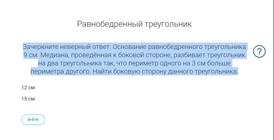 Зачеркните неверный ответ. Основание равнобедренного треугольника 9 см. Медиана, проведённая к боковой стороне, разбивает треугольник на два треугольника так, что периметр одного на 3 см больше периметра другого. Найти боковую сторону данного треугольника.