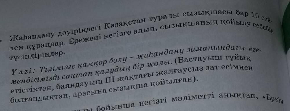 Жаһандану дәуіріндегі Қазақстан туралы сызықшасы бар 10 сөйлем құраңдар.