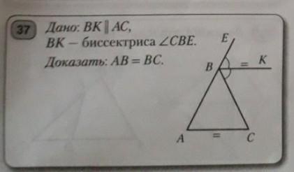 УголКВС=АСАкак накр.лежащ.при парал. прям.и секущей.Угол ВЕА=180.пустьЕВК=х,а,уголАВС=у.тогда2х+у=180внешний угол равен сумме двух внутренних не смежных с ним.уголА+уг.С=2хуголС=х,кг.А=2*х-х=х.уг.А=уг.С, треугольник АВС равнобедр.следоват.Ав=Вс.