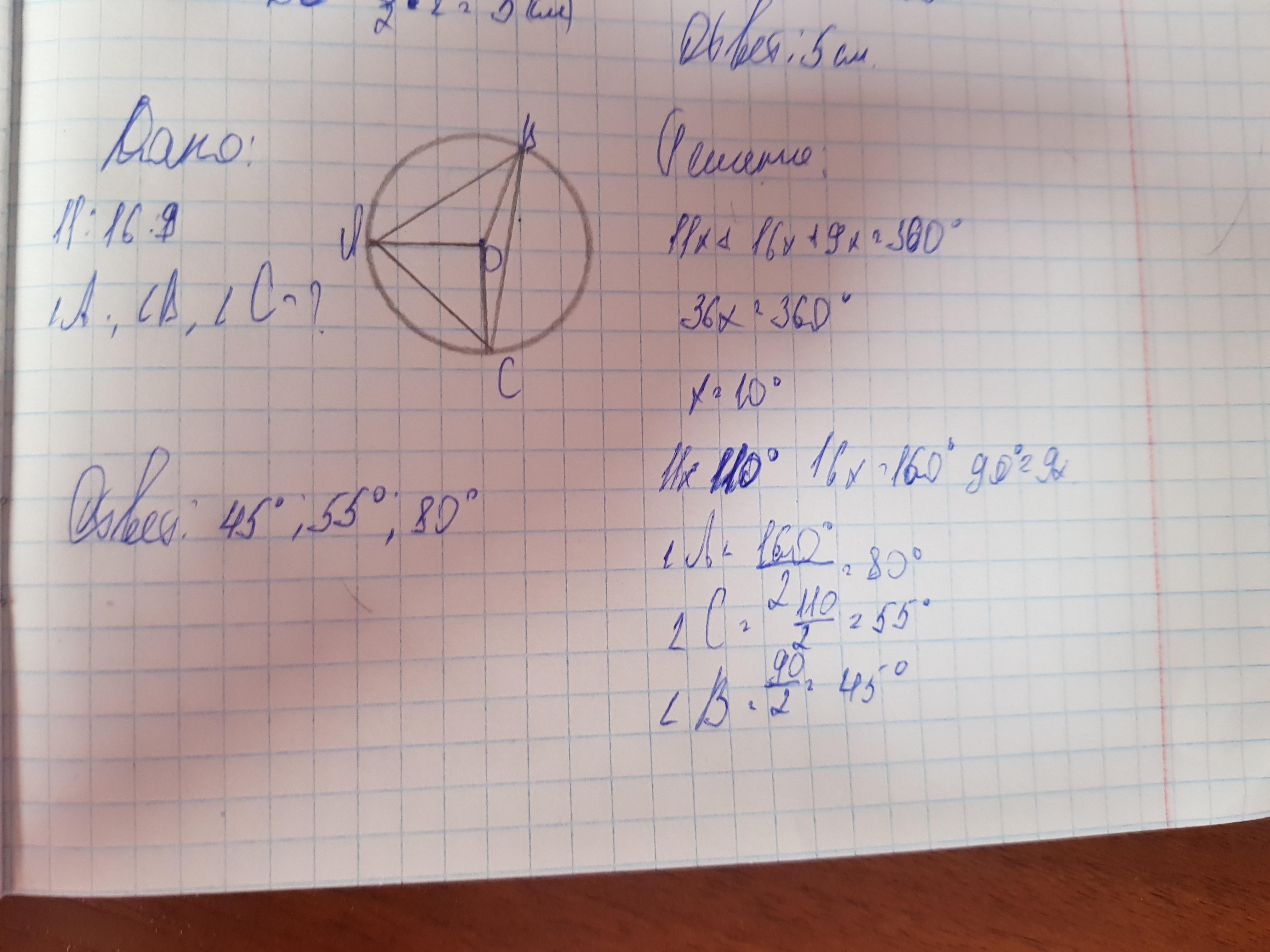Окружность разделена на три части, градусные меры которых относятся как 11:16:9. Найдите углы треугольника, полученного последовательным соединением точек деления.