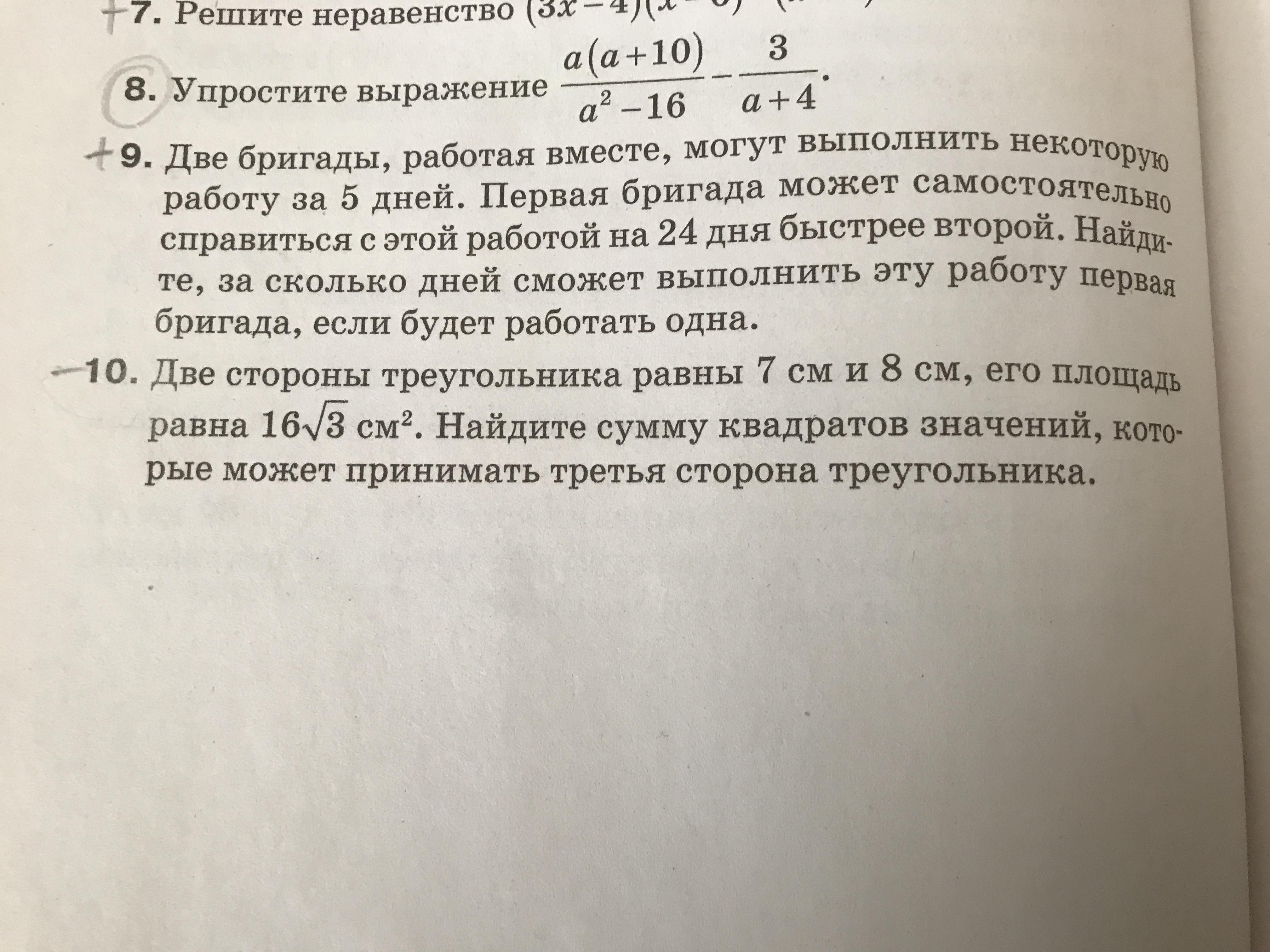 Две стороны треугольника 7 см и 8 см, его площадь равна 16√3 см² .Найдите сумму квадратов значений, которые может принимать третья сторона треугольника