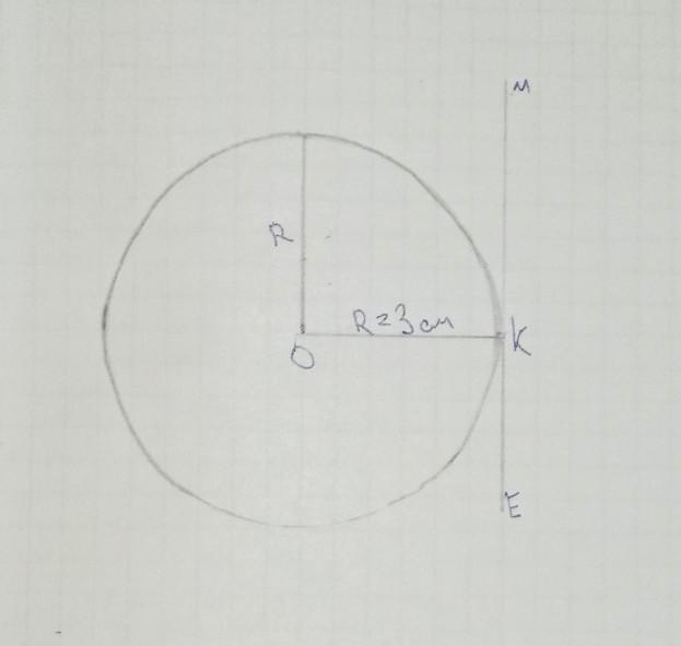 Построить окружность с центром в точке О, радиусом 3 см. Произвольно, выбрать на окружности точку К, провести через точку К касательную МЕ к окружности с центром в точке О(r=3см)