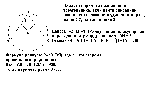 Найдите периметр правильного треугольника, если центр описанной около него окружности удален от хорды, равной 2, на расстояние 3.