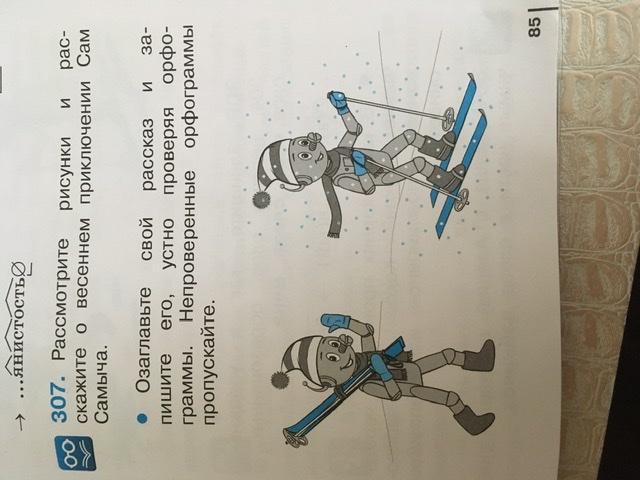 Всю зиму Сам Самыч катался на лыжах. Он не заметил ,ка наступтла весна. Однажды он по привычке пошнл кататься снова. Но весна то уже пришла Снег растаял И получилось не катание на лыжах по снегу,а шлепанье по лкжам. Подхватил яСам Самыч лыжи и вернулся домой.