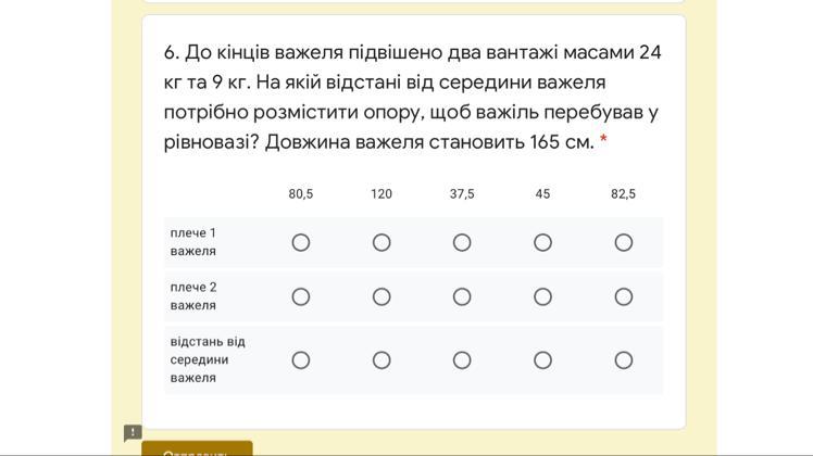 165см/2 = 82,5см, а значит при расчёте от середины рычага точка опоры окажется сдвинута в сторону тяжелого груза на 82,5см - 45см = 37,5см