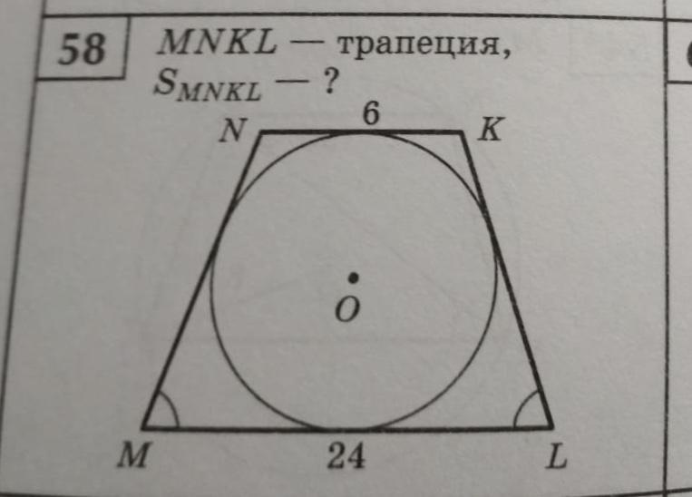 MN=KL=30/2=15. Из треугольника AMN, по теореме Пифагора находим AN, т.е. высоту. AN=12. Тогда S= 12 • (6+24)/2= 180.